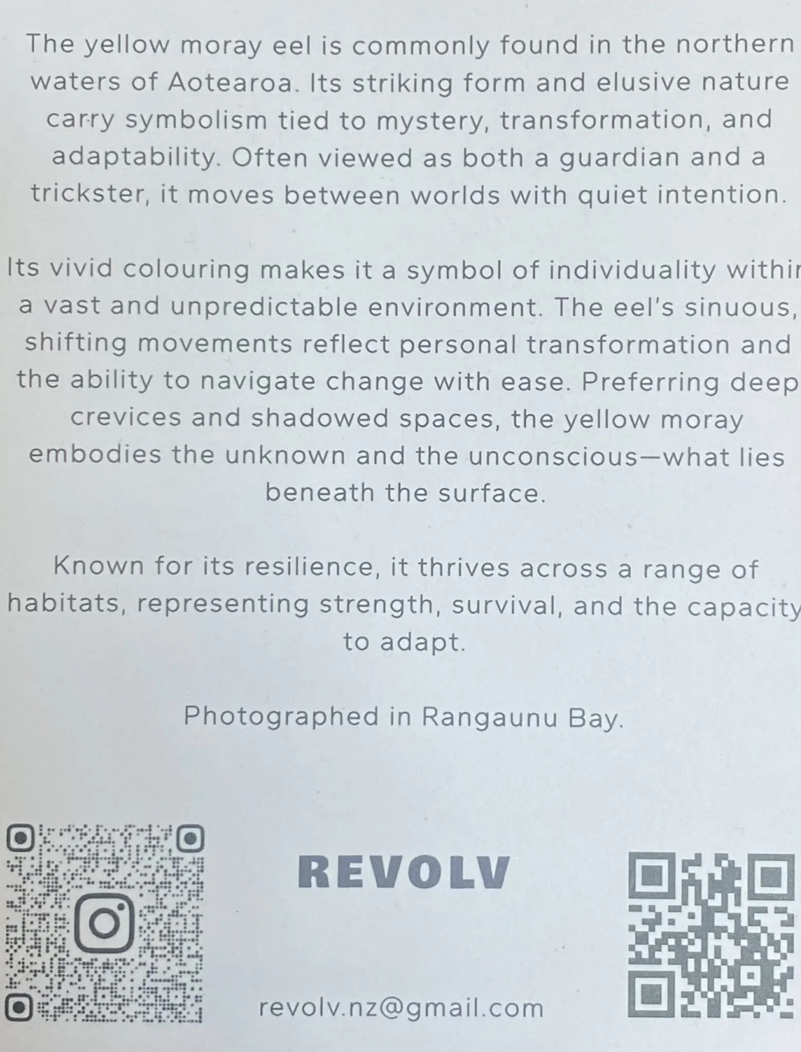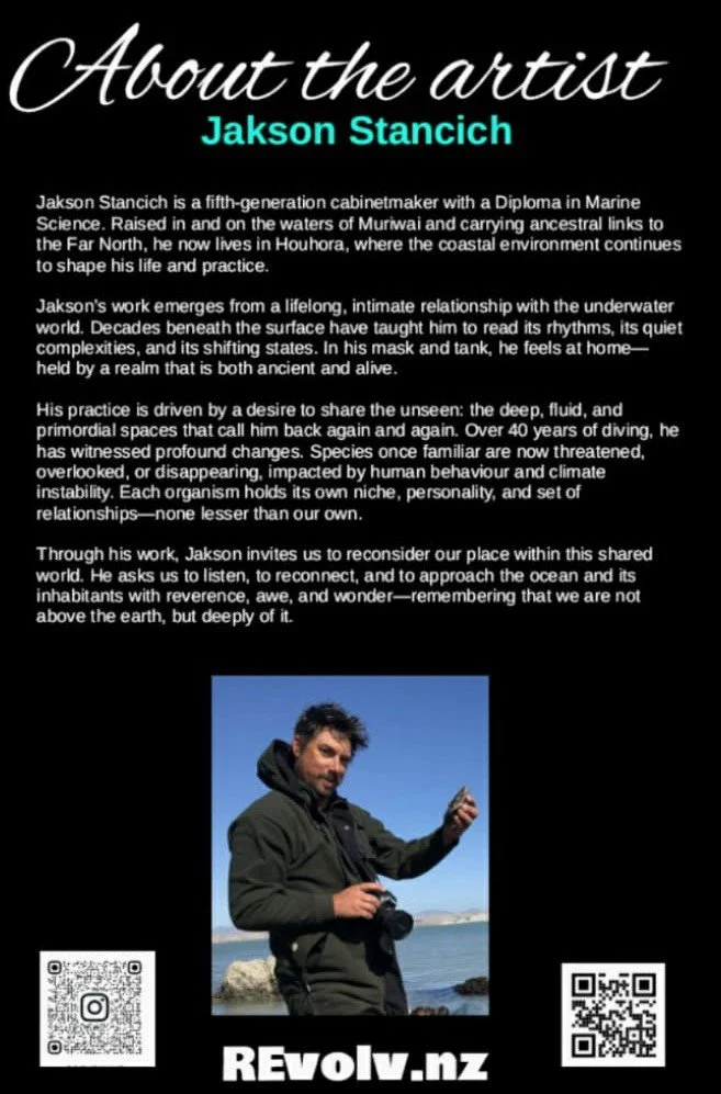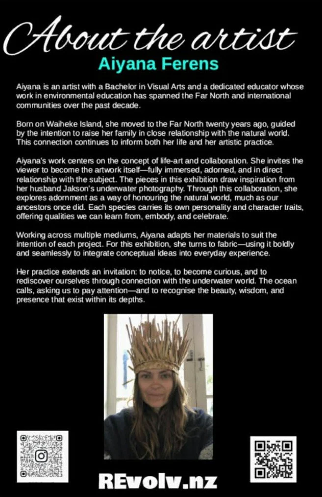 Nestled in the Far North of Aotearoa, Revolv is New Zealand’s northernmost art gallery + studios, where ocean, nature, and artistry merge. Founded by artists and environmental educators Jak and Aiyana, it was born from their passion for marine conservation and creative expression. Their backgrounds in marine science and environmental education shape Revolv’s mission—to inspire awareness through art. Returning to their roots, they turned to underwater photography, handcrafted woodwork, and wearable art as a way to tell stories of the sea. Revolv is a space to pause, reflect, and connect with the beauty of the natural world.
